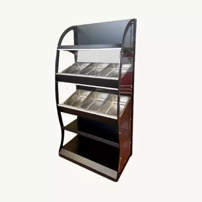 Duvar gibi sistemler için yapılmış duvar tipi zeytinlik reyonlarıdır. Estetik görünümüyle dikkatleri üstüne toplar. Üst kısmı raflı zeytin yağları konulur. Tasarımı sayesinde müşterileri daha fazla satın almaya teşvik ediyor! Raf sistemiyle kullanım kolaylığı sağlar.